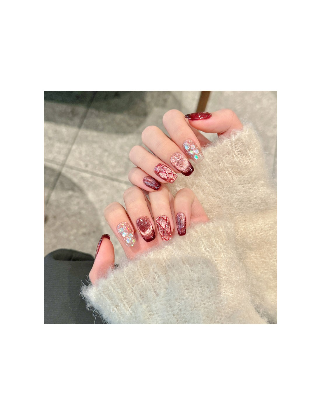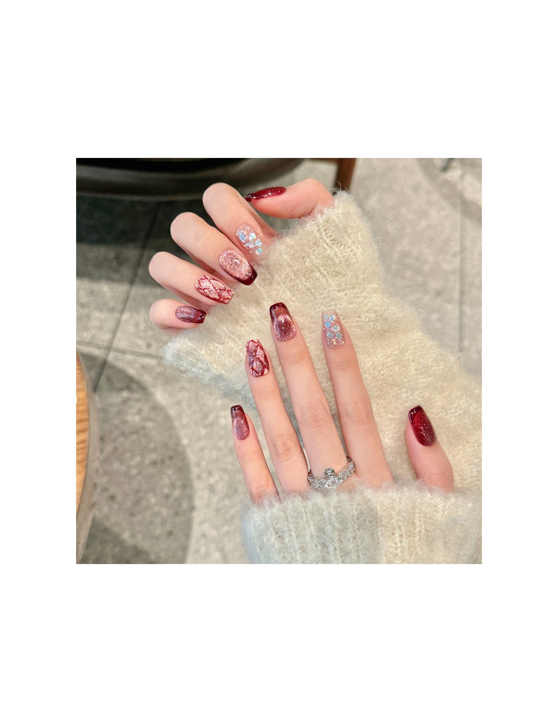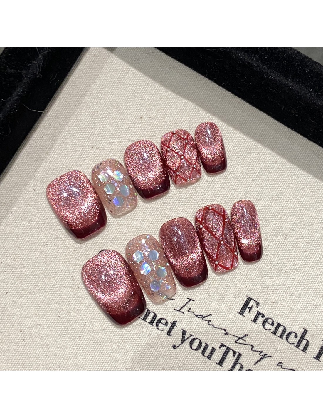 Atrévete a destacar con nuestro set de uñas postizas press on, hechas a mano en un intenso y elegante rojo. Su efecto ojo de gato crea reflejos profundos y brillantes que cambian con la luz, mientras los detalles de cristales y pedrería aportan un toque glamuroso y sofisticado que llama todas las miradas.