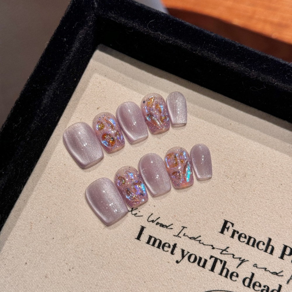 Luce una manicura femenina, delicada y sofisticada con nuestro set de uñas postizas press on, hechas a mano en un encantador tono rosa. Su efecto ojo de gato aporta un brillo sutil y cambiante, mientras los cristales rosados realzan el diseño con un toque elegante y luminoso.