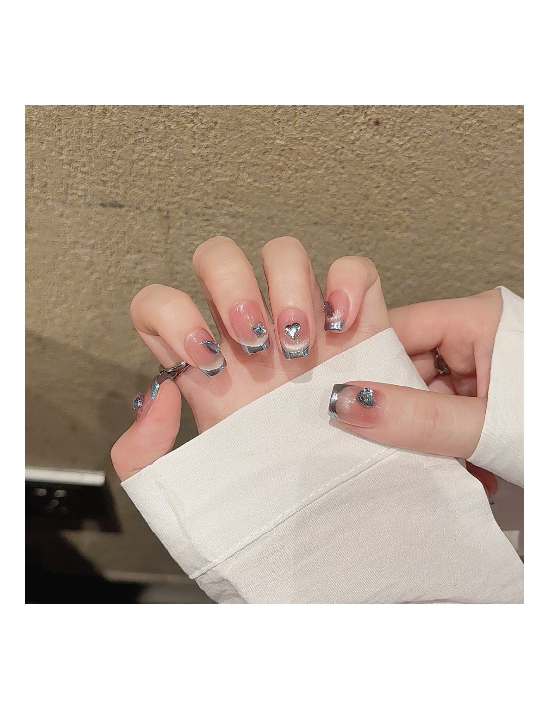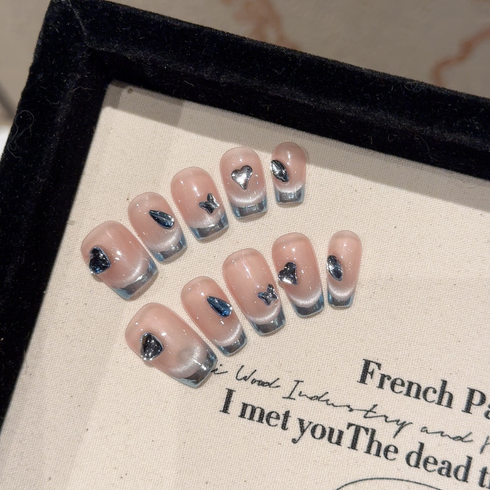 Descubre el equilibrio perfecto entre sofisticación y encanto con nuestro set de uñas postizas press on hechas a mano en tonos rosa y azul iridiscente. Su brillo metálico y los delicados cristales azules evocan la profundidad del mar, mientras que el efecto ojo de gato crea destellos únicos que cambian con la luz.