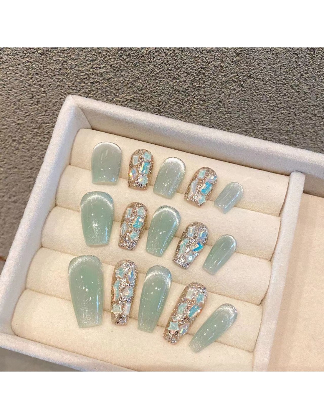 Set de 10 uñas postizas press-on verdes con cristales brillantes.