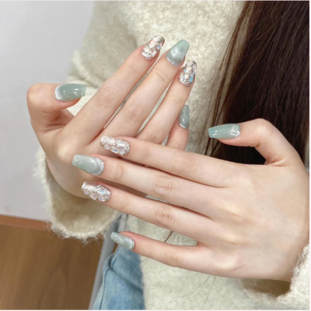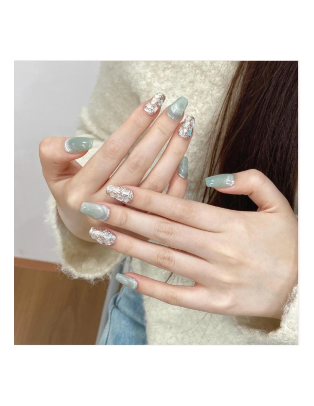 Dale un toque elegante, moderno y único a tus manos con este set de uñas postizas press on verde oliva, cuidadosamente hechas a mano para ofrecerte un acabado profesional sin salir de casa. Su espectacular efecto ojo de gato crea reflejos brillantes que cambian con la luz, mientras que los cristales y pedrería decorativa añaden un toque de glamour.
