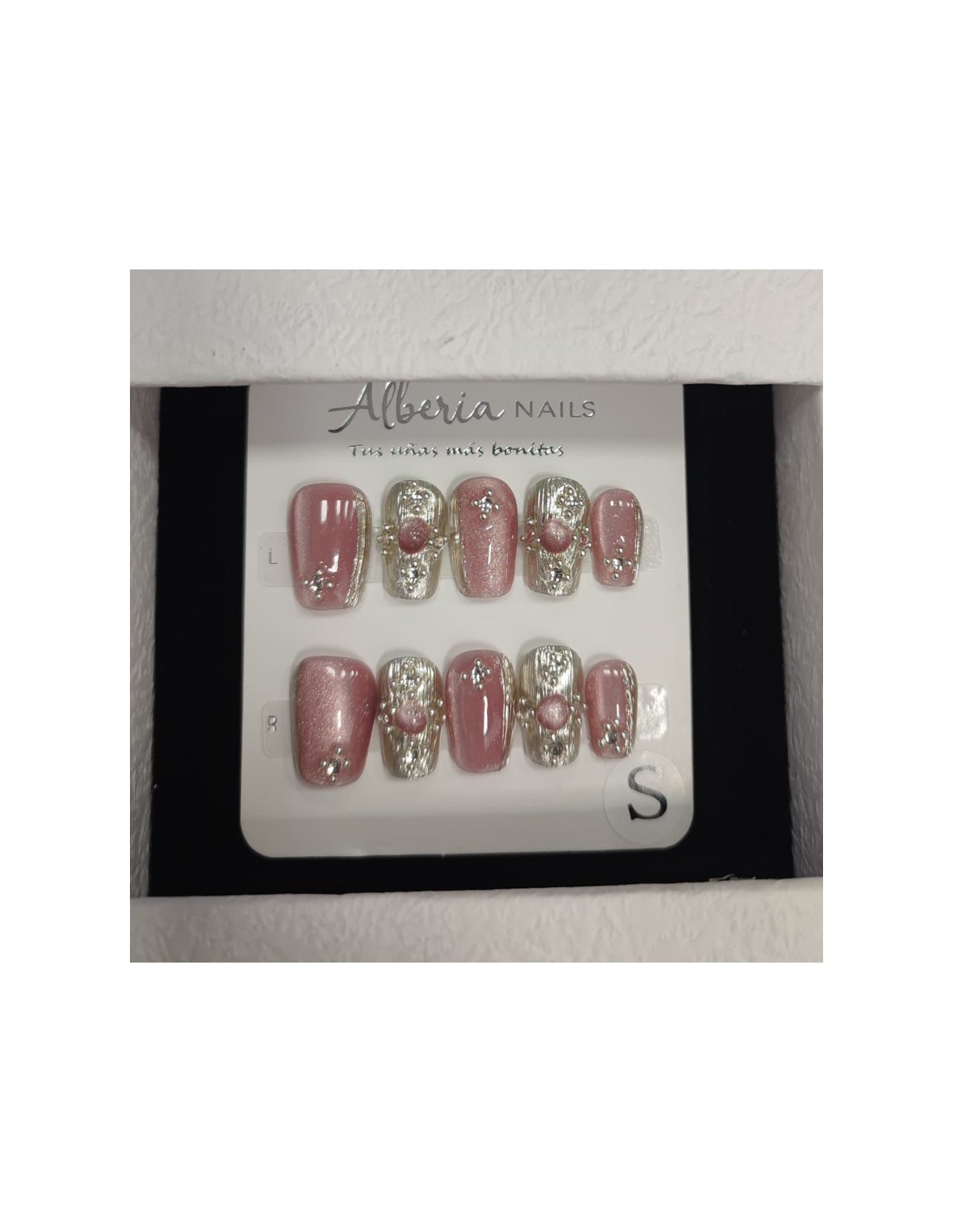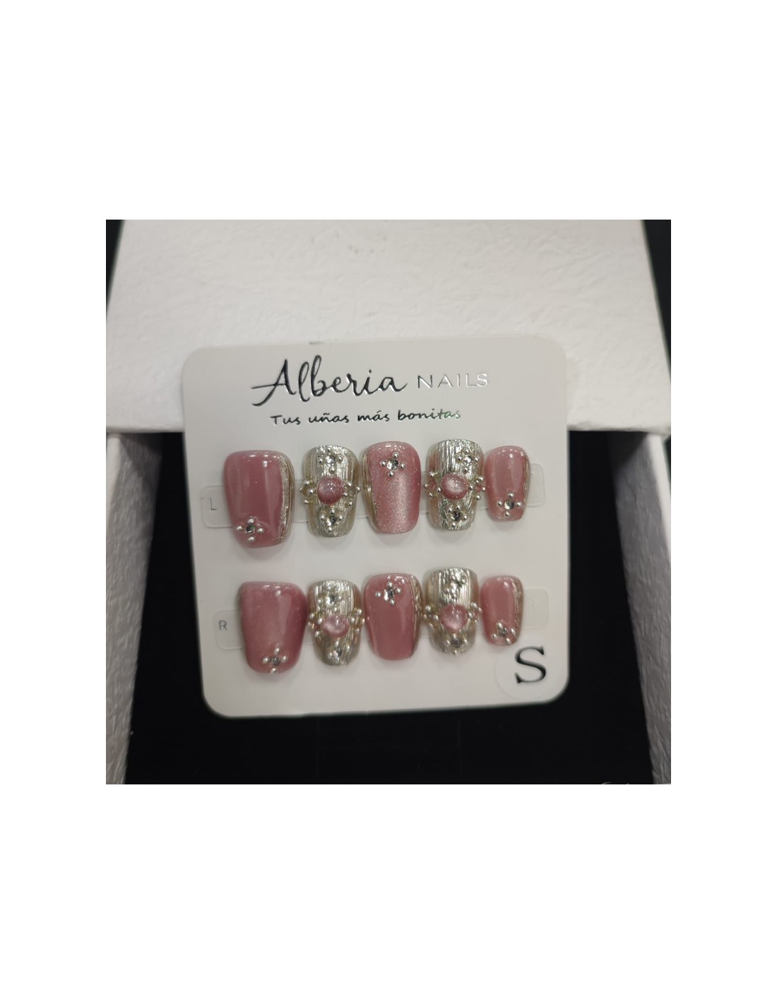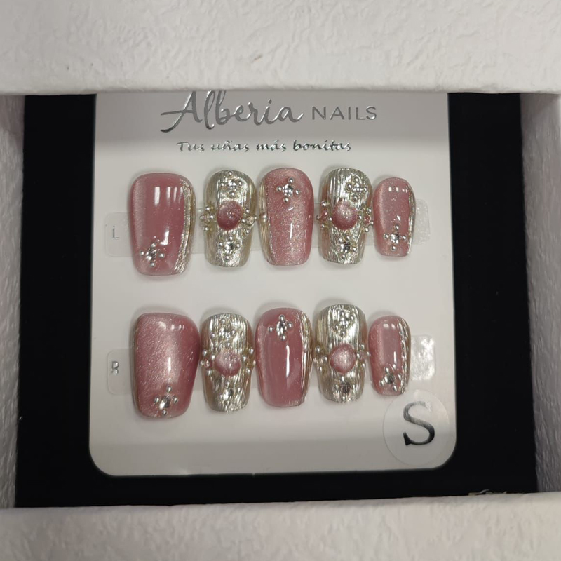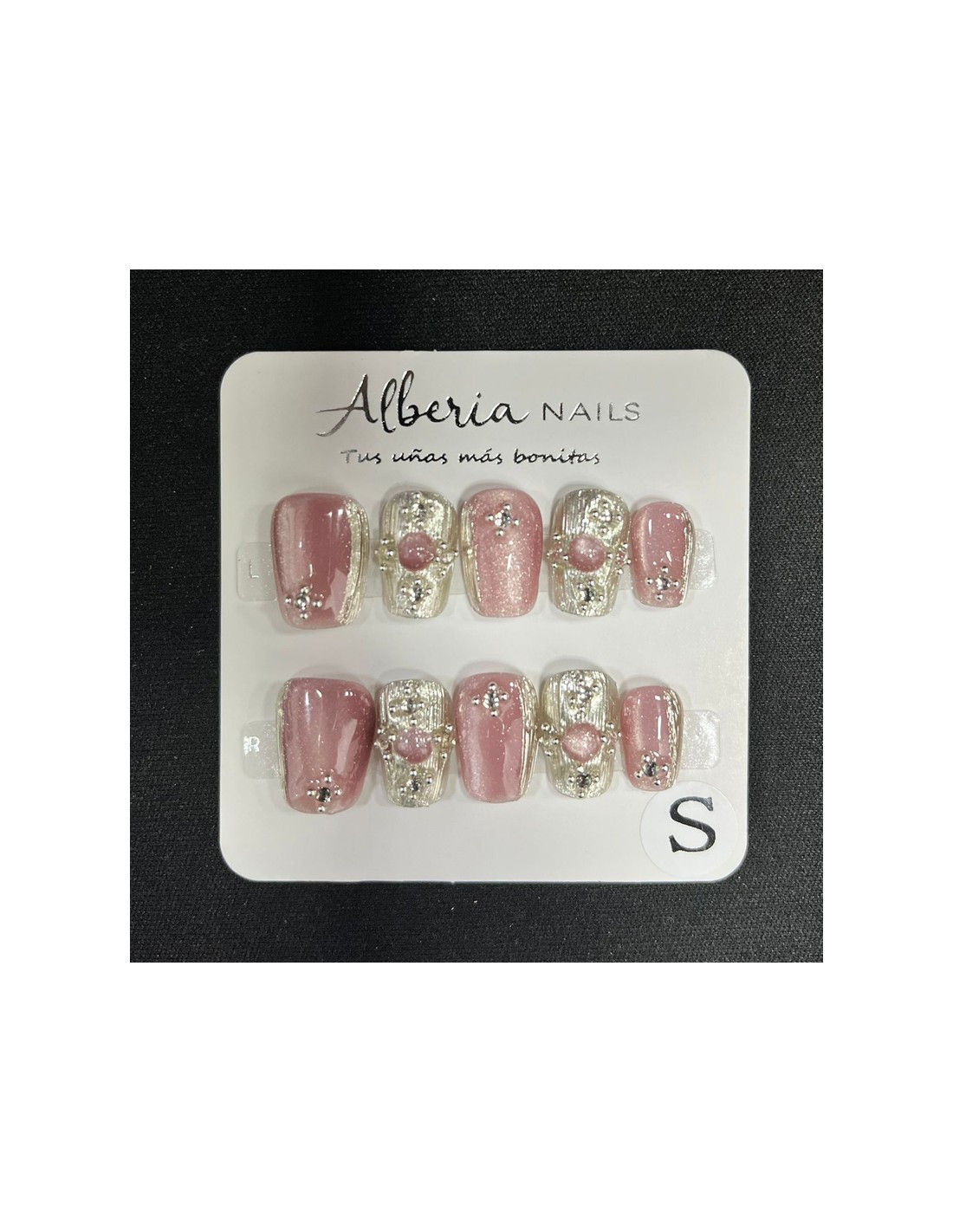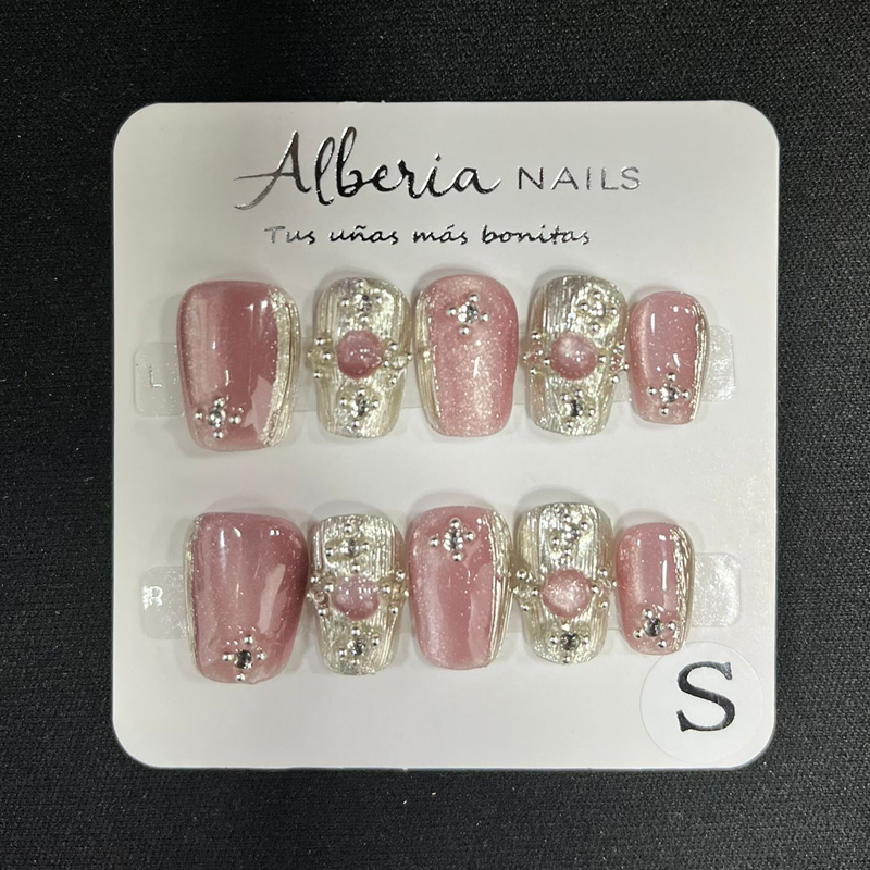 Uñas Postizas Press On Rosa con Detalles Plateados