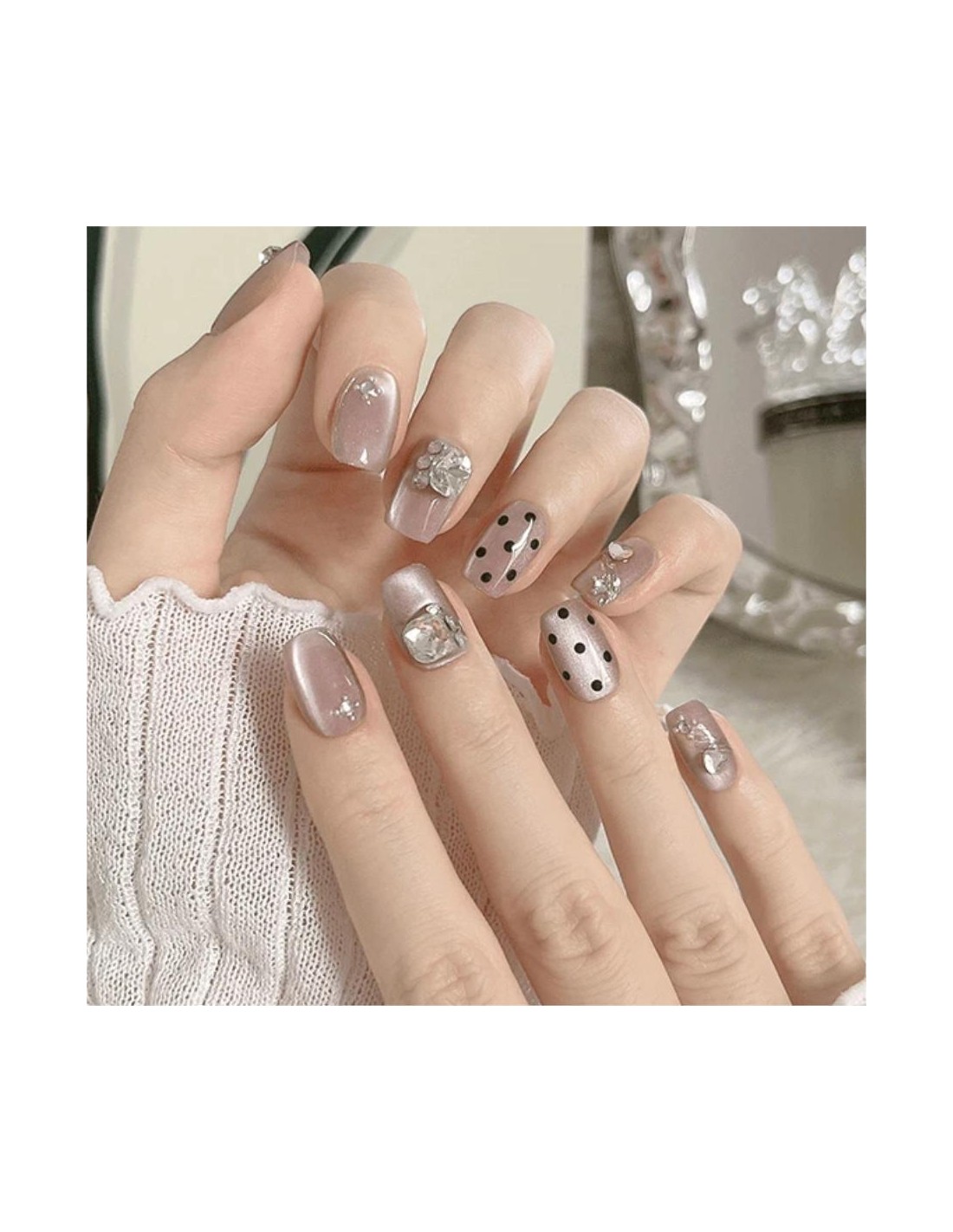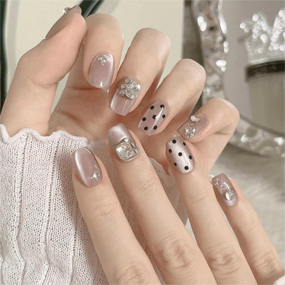Uñas Postizas Press On Rosa Claro con Ojo de Gato, Lunares y Cristales – Delicadeza y Brillo Divertido
