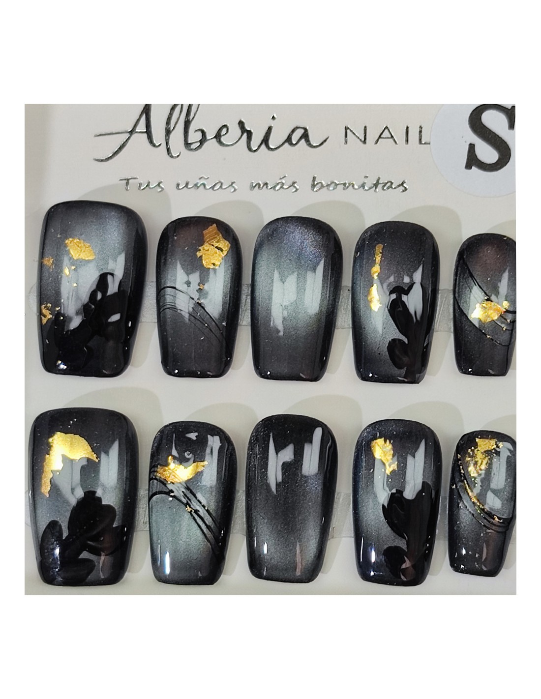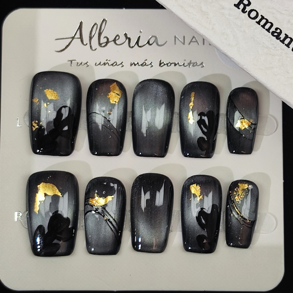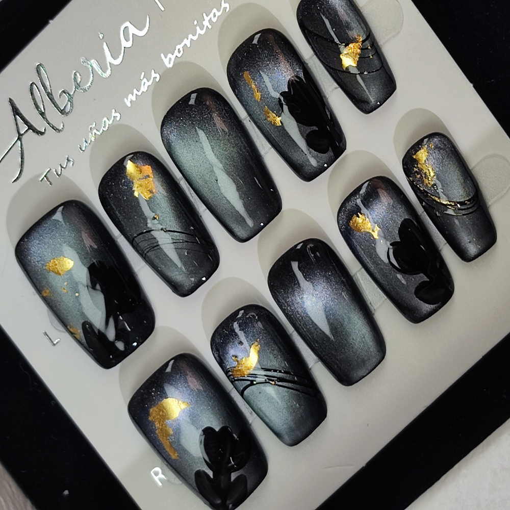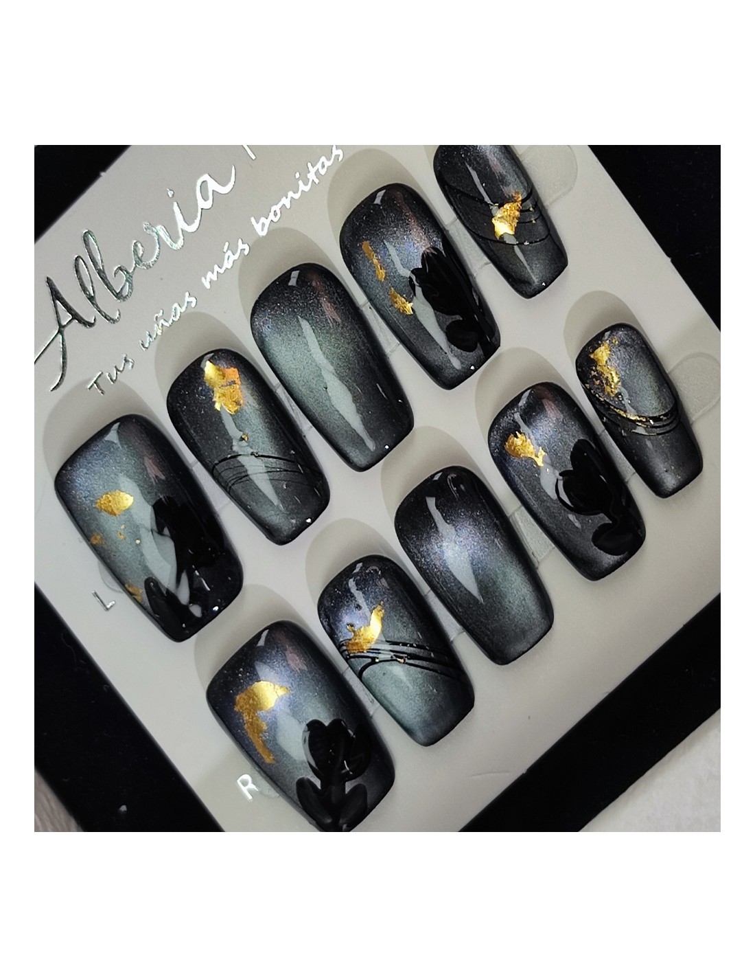 Descubre nuestras uñas press on en color negro con detalles dorados y delicadas flores negras, un diseño sofisticado que combina misterio y elegancia. El contraste entre el negro intenso y los acentos dorados crea un efecto lujoso y llamativo, perfecto para destacar en cualquier ocasión.