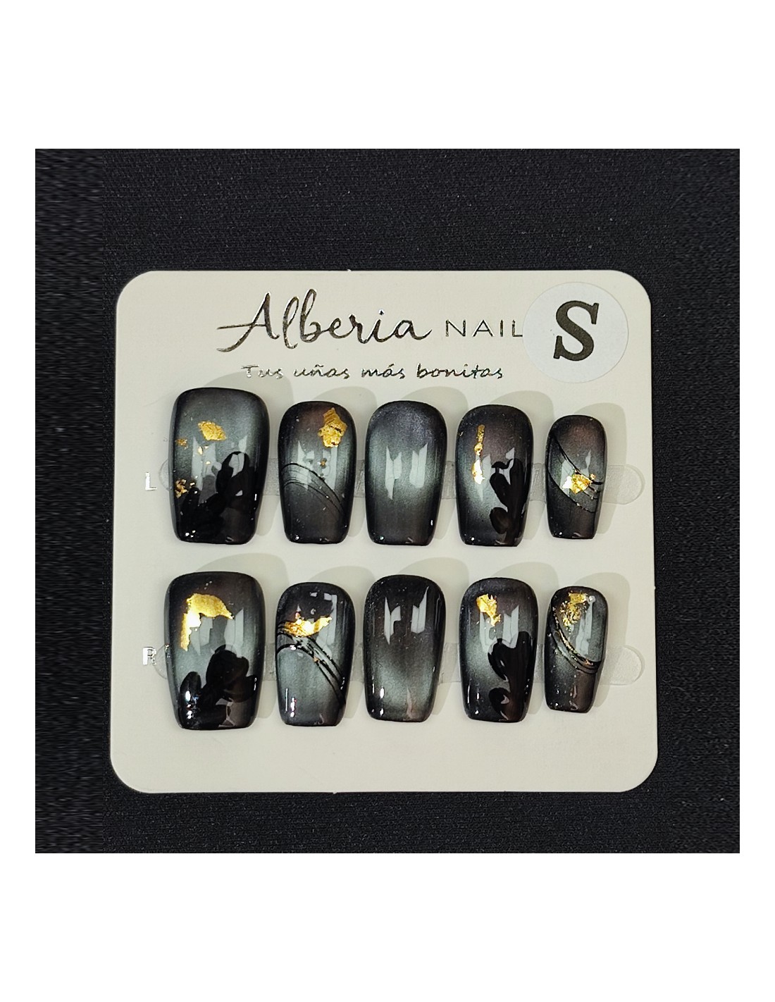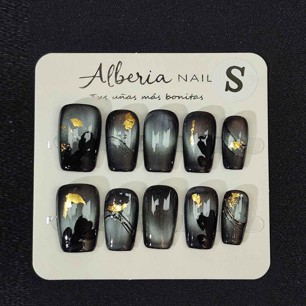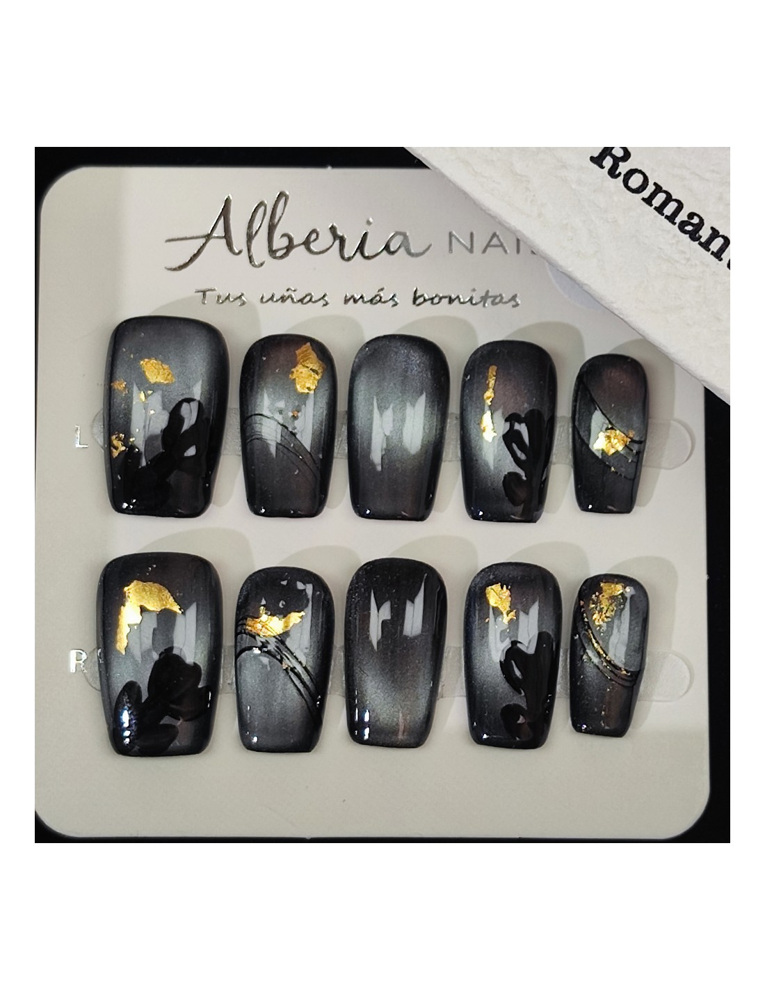 Descubre nuestras uñas press on en color negro con detalles dorados y delicadas flores negras, un diseño sofisticado que combina misterio y elegancia. El contraste entre el negro intenso y los acentos dorados crea un efecto lujoso y llamativo, perfecto para destacar en cualquier ocasión.