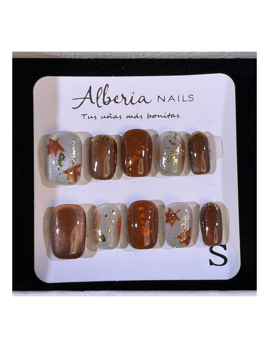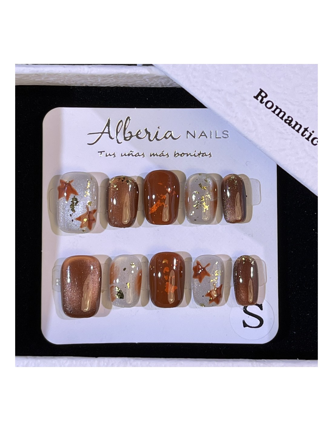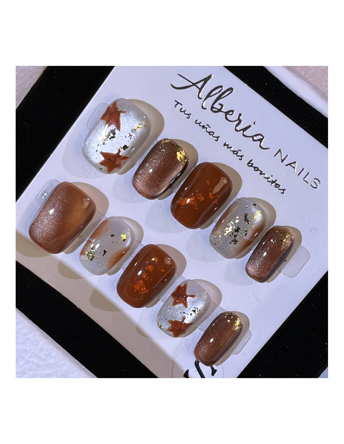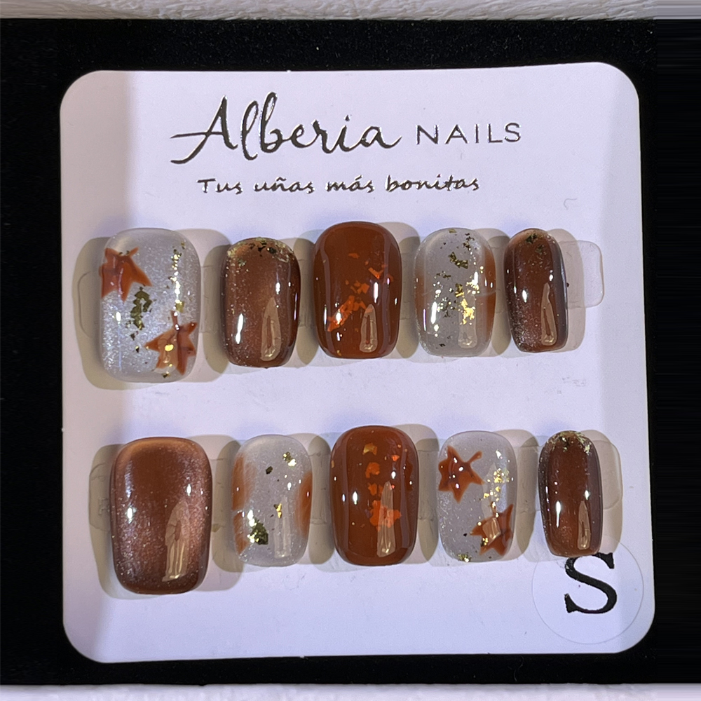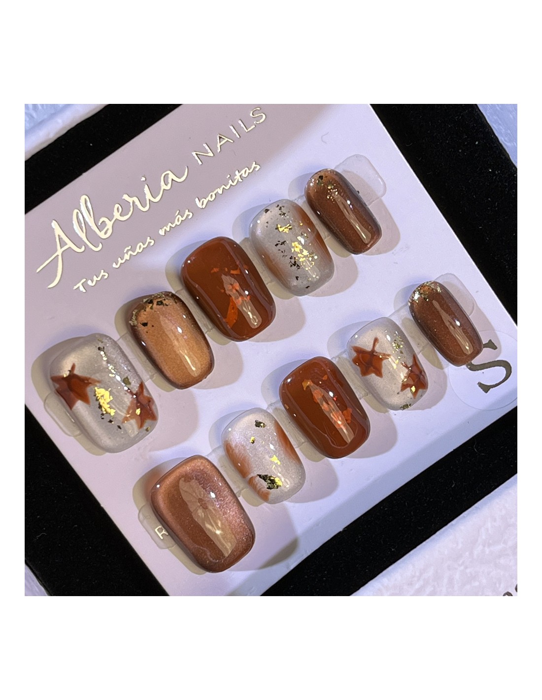 Descubre nuestras uñas press on en tono marrón con detalle de hojas y ojo de gato, un diseño sofisticado que refleja elegancia y exclusividad. El color caramelo aporta calidez y distinción, mientras el blanco y los dibujos de hojas con ojo de gato añade un brillo sutil tipo joya que eleva cualquier look.