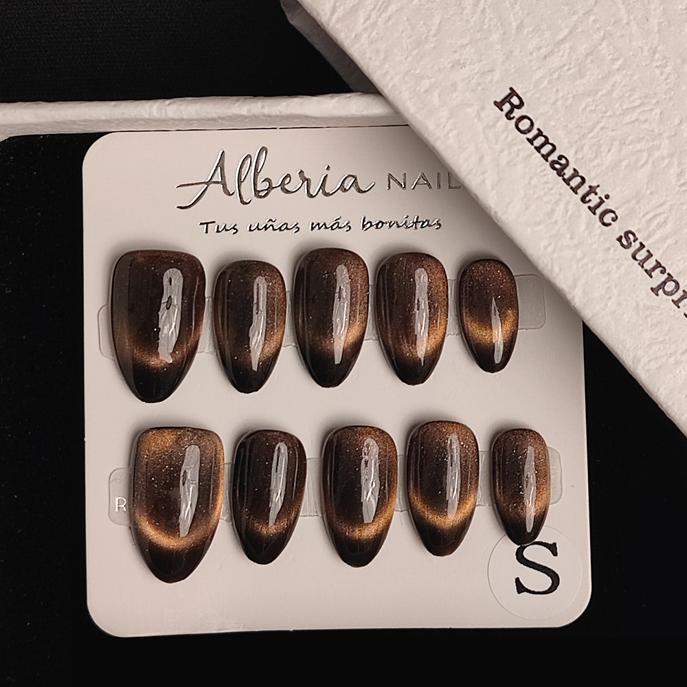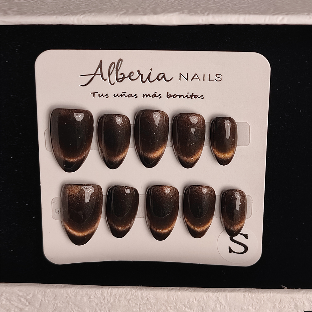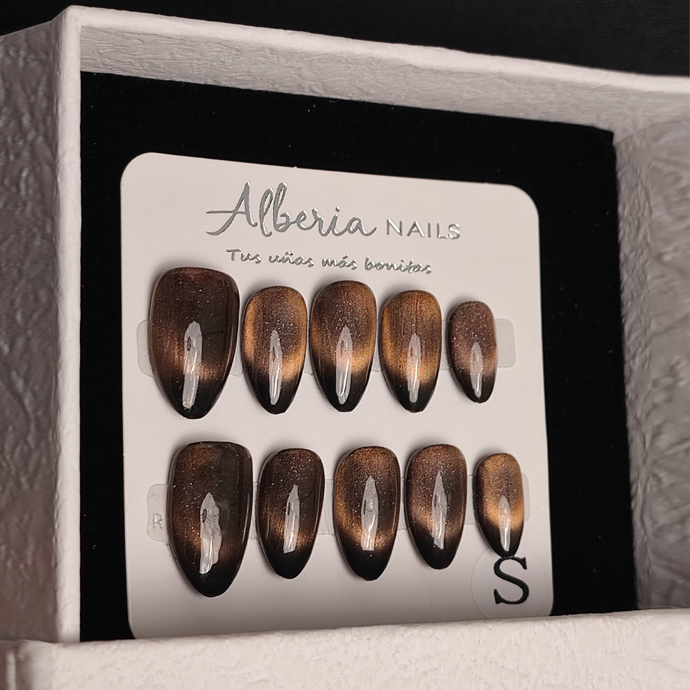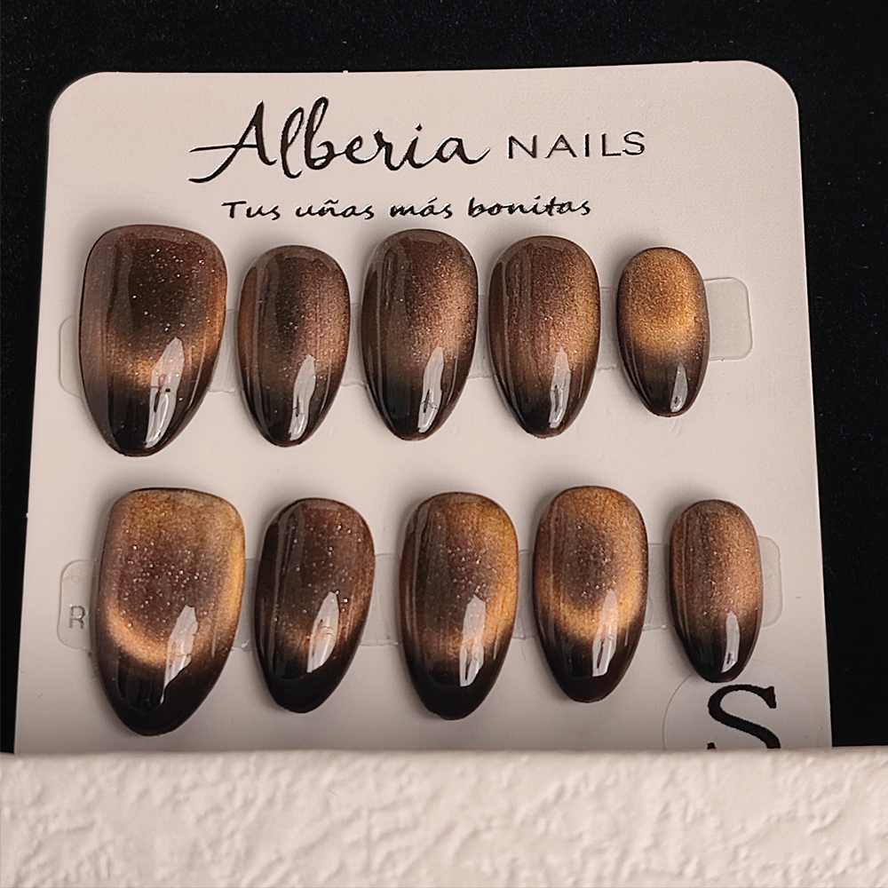 Descubre nuestras uñas press on de forma almendrada con degradado marrón un diseño elegante y atemporal inspirado en los tonos cálidos del ámbar y el chocolate. Su efecto crea un acabado sofisticado y único, perfecto para quienes buscan un estilo clásico con un toque moderno.