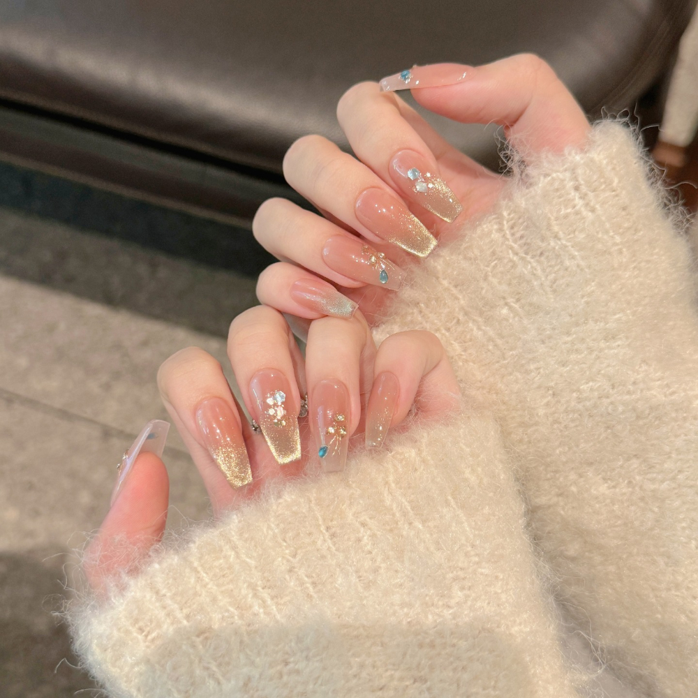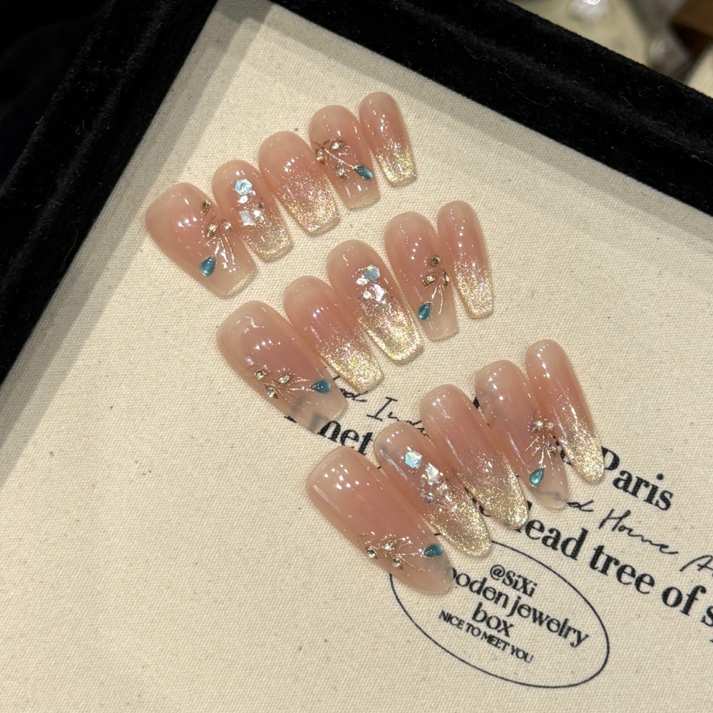 Eleva tu estilo con nuestro set de uñas postizas press on, hechas a mano en un elegante color natural que combina con todo. Su diseño exclusivo incorpora un delicado detalle de espiga con cristales brillantes, aportando un toque refinado y luminoso que realza tu manicura.