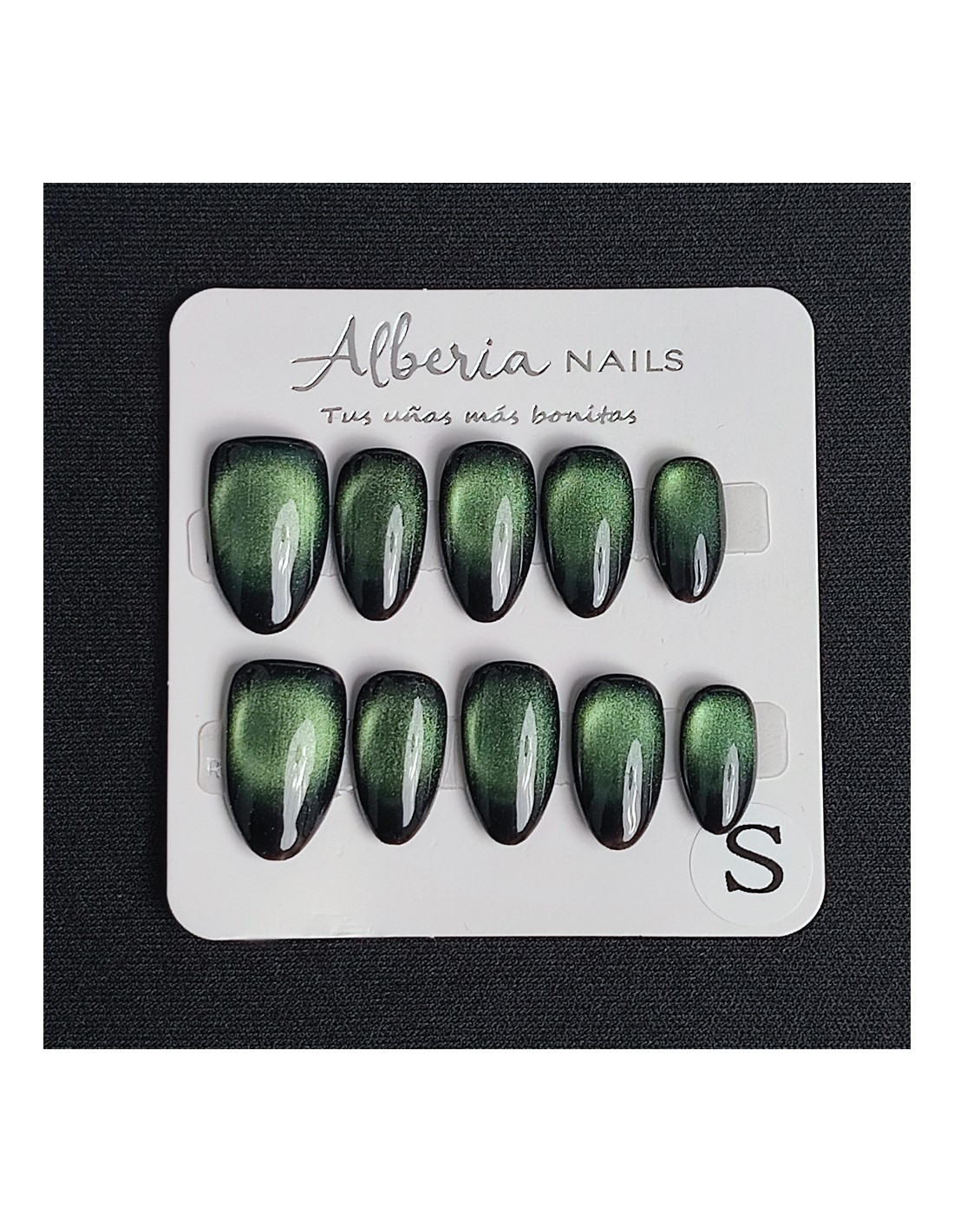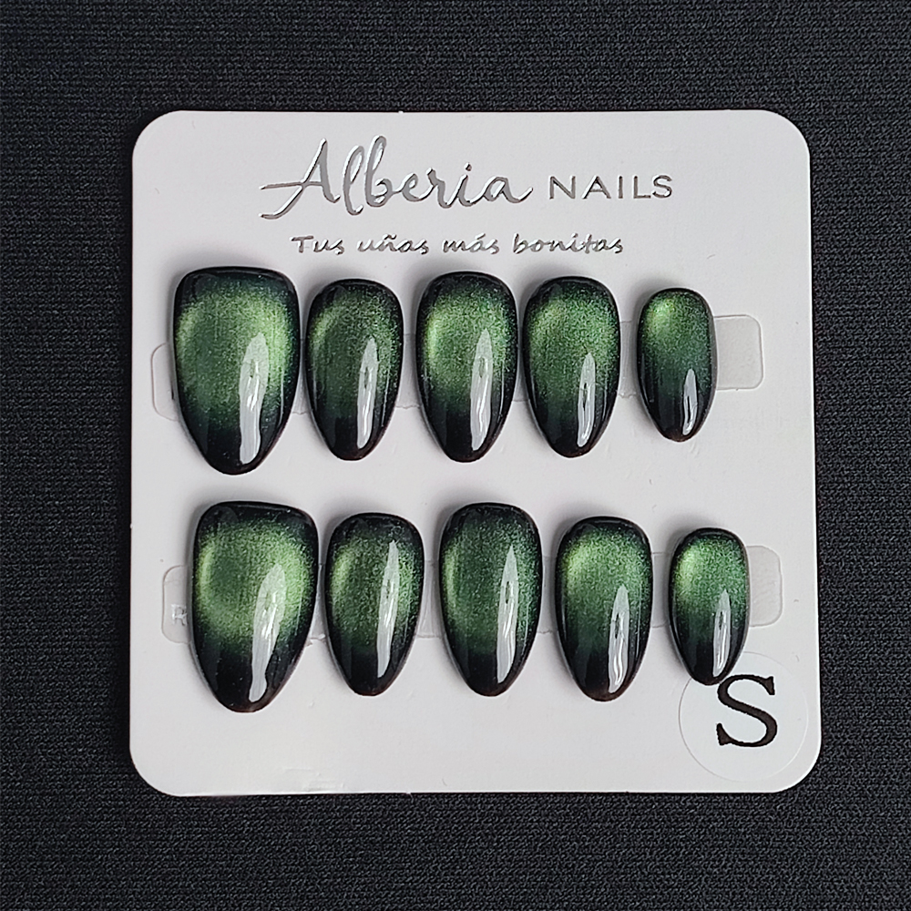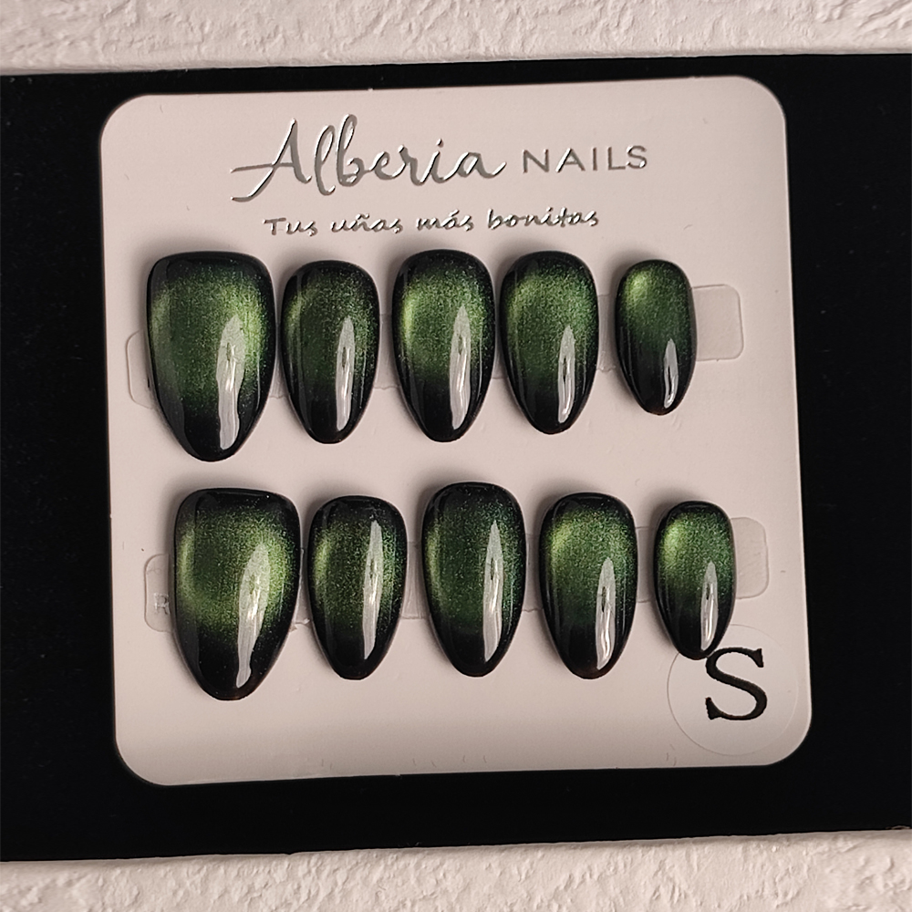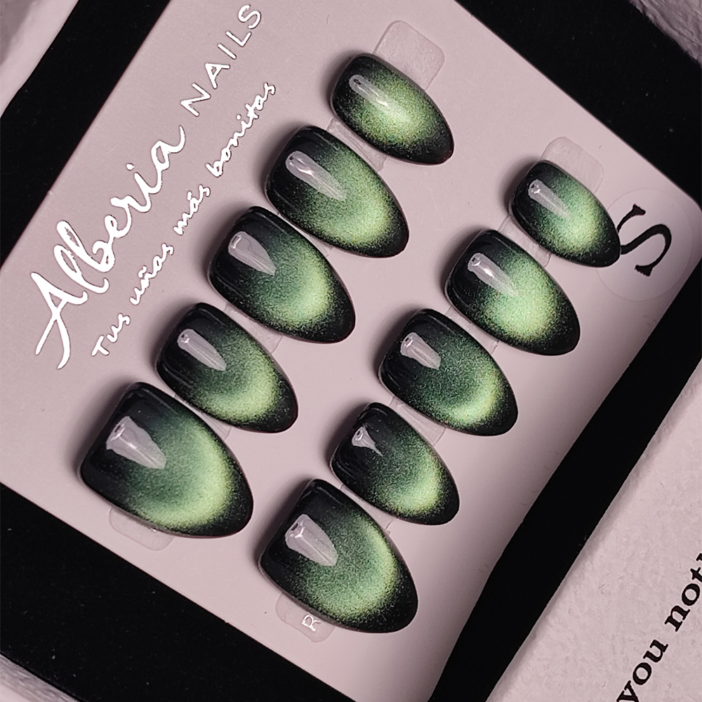 Descubre nuestras uñas press on de forma almendrada color verde un diseño elegante y atemporal inspirado en los tonos verdosos. Su efecto crea un acabado sofisticado y único, perfecto para quienes buscan un estilo clásico con un toque moderno.
