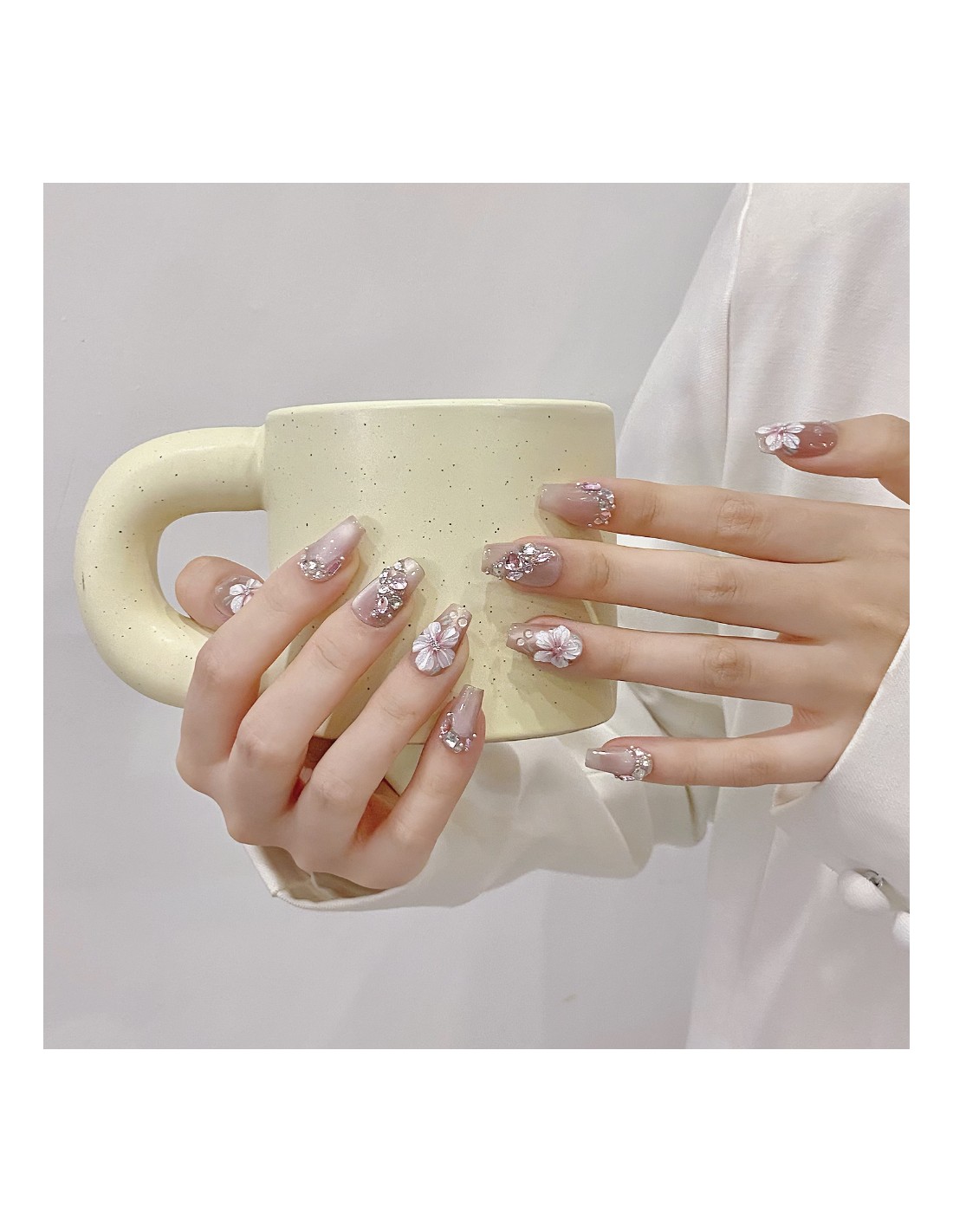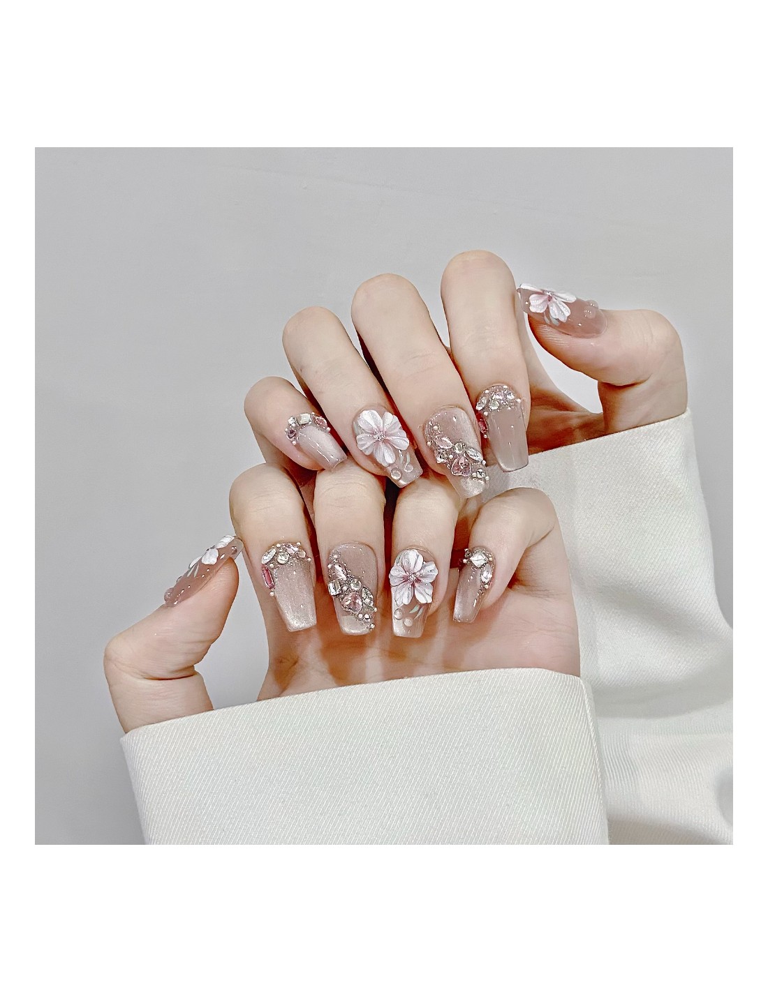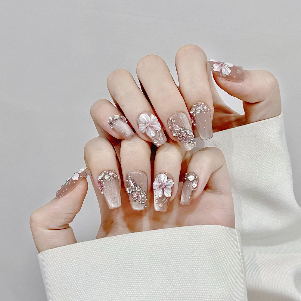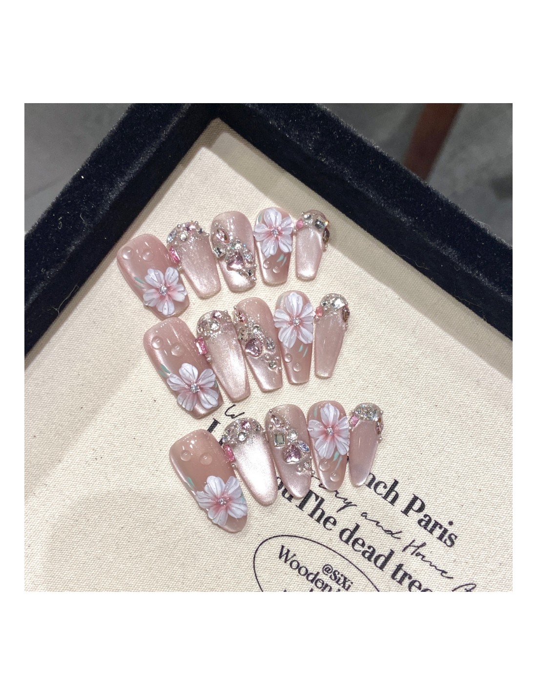 Eleva tu manicura con este elegante set de uñas postizas press on, hechas a mano en un delicado tono lila. Su efecto ojo de gato aporta un brillo profundo y sofisticado que cambia con la luz, mientras que los detalles de flores y la línea de cristal añaden un toque romántico y luminoso, perfecto para cualquier ocasión.