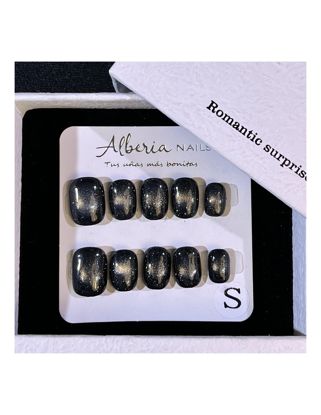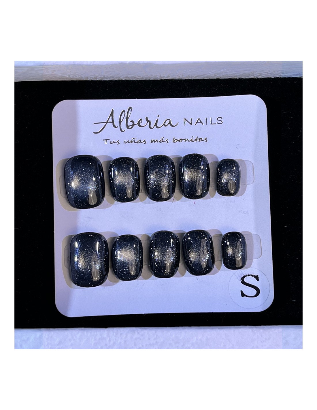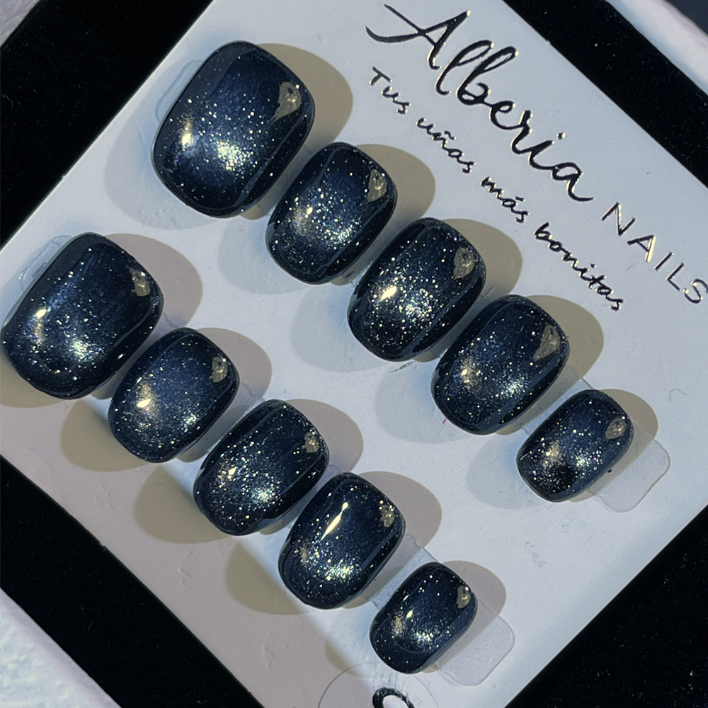 Luce un estilo moderno, sofisticado y con carácter con nuestras uñas postizas press on en negro con destellos en gris. El contraste entre el negro intenso y los sutiles reflejos grisáceos crea un efecto brillante y elegante que cambia con la luz, aportando un toque misterioso y llamativo.