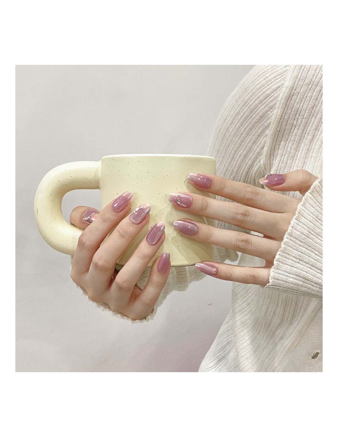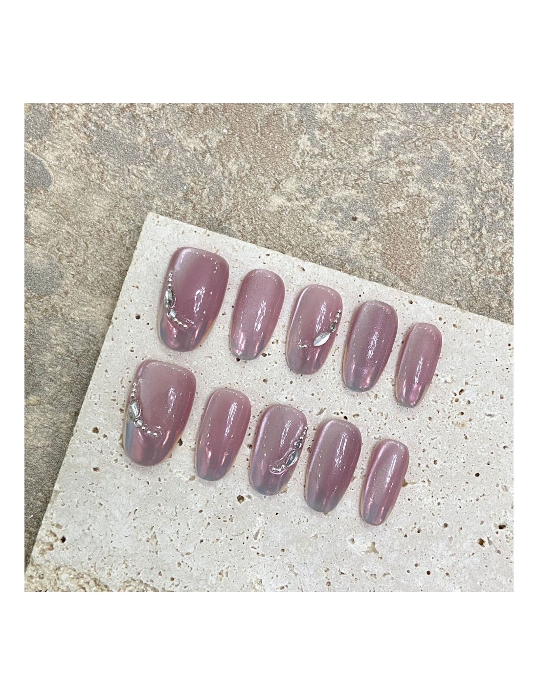 Luce unas manos elegantes y sofisticadas con este set de uñas postizas hechas a mano en tono malva iridiscente. Su acabado brillante metálico y detalles decorativos plateados las convierten en el accesorio perfecto para elevar tu estilo en cualquier ocasión: fiestas, citas o simplemente para el día a día.