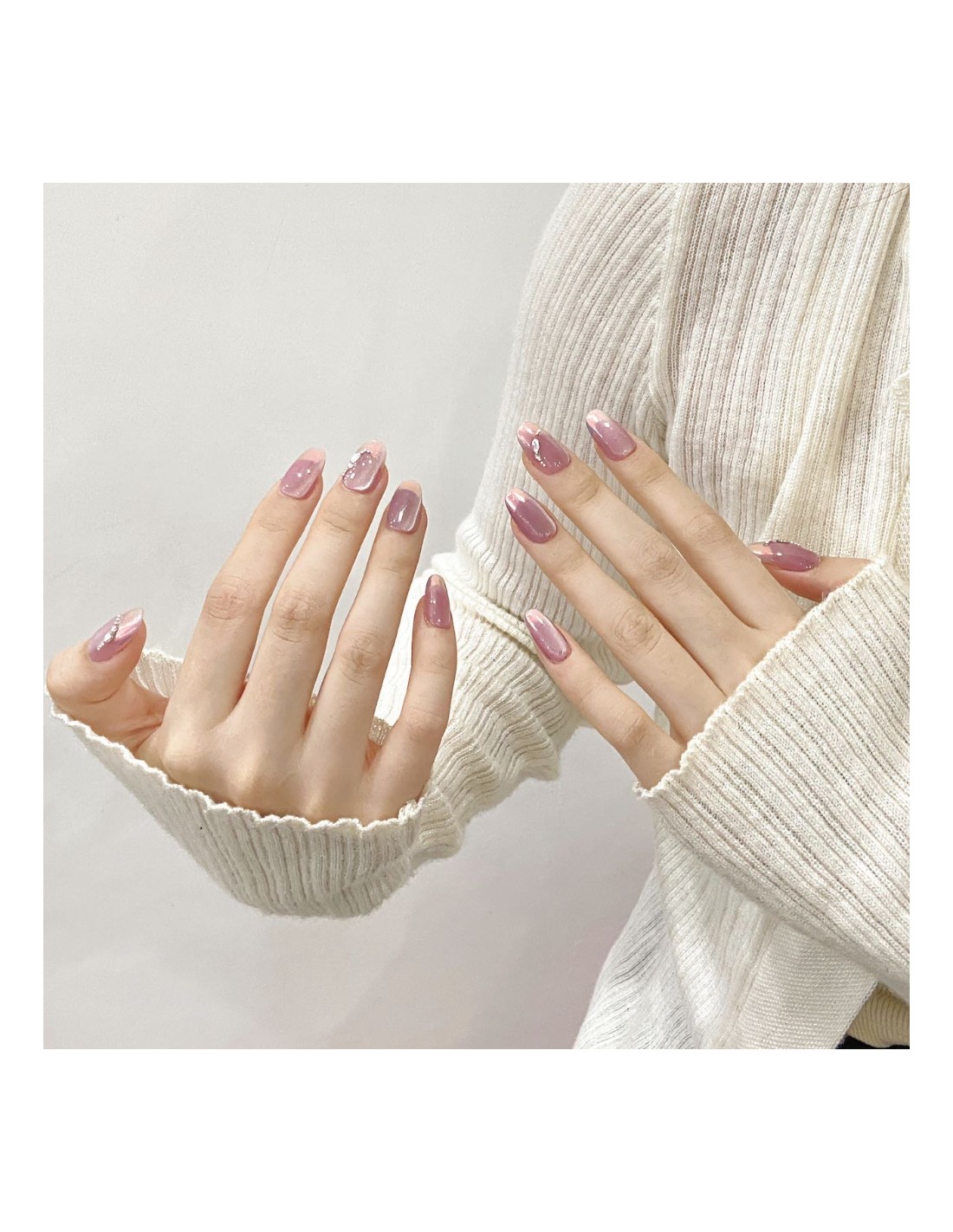 Luce unas manos elegantes y sofisticadas con este exclusivo set de uñas postizas press on hechas a mano en un delicado tono malva iridiscente. Su acabado metálico brillante cambia con la luz, mientras que los detalles plateados aportan un toque glamuroso y moderno.