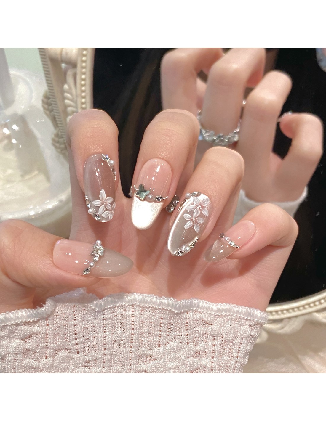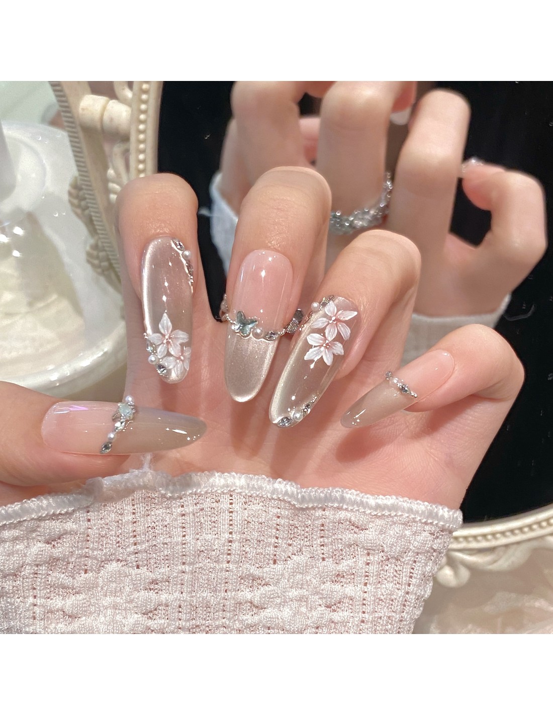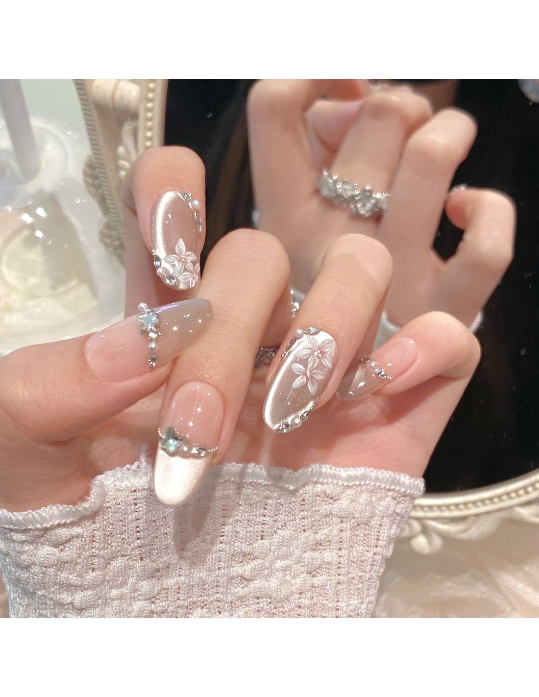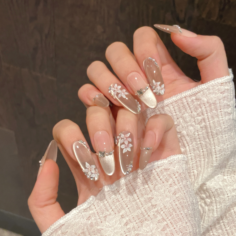 Dale a tus manos un toque de delicadeza y sofisticación con nuestro set de uñas postizas cortas press on, hechas a mano en un elegante tono beige. Su efecto ojo de gato crea reflejos sutiles que cambian con la luz, mientras los detalles de flores y cristales aportan un brillo encantador y un estilo fresco.