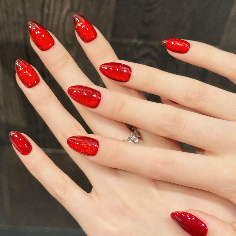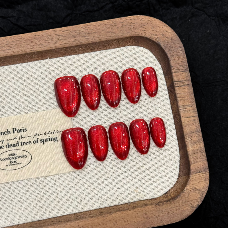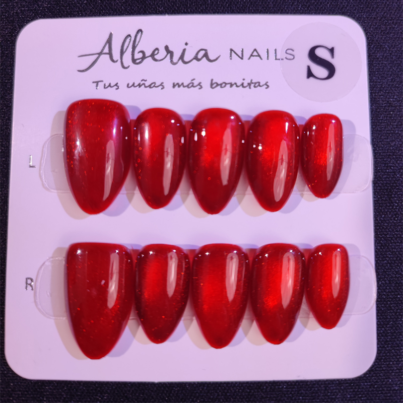 Descubre nuestras uñas press on postizas rojas con efecto ojo de gato, un diseño elegante y llamativo que aporta un acabado profesional en segundos. Su forma almendrada estiliza la mano y alarga visualmente los dedos, logrando una manicura moderna y sofisticada sin necesidad de ir al salón.