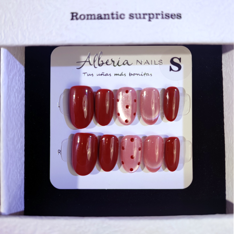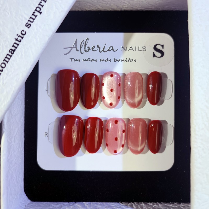 Dale un toque divertido y femenino a tu look con nuestras uñas postizas press on rojas y rosas con lunares, un diseño lleno de encanto que combina dulzura, estilo y personalidad. El contraste entre el rojo vibrante y el rosa suave, decorado con delicados puntitos, crea una manicura alegre, moderna y súper llamativa.