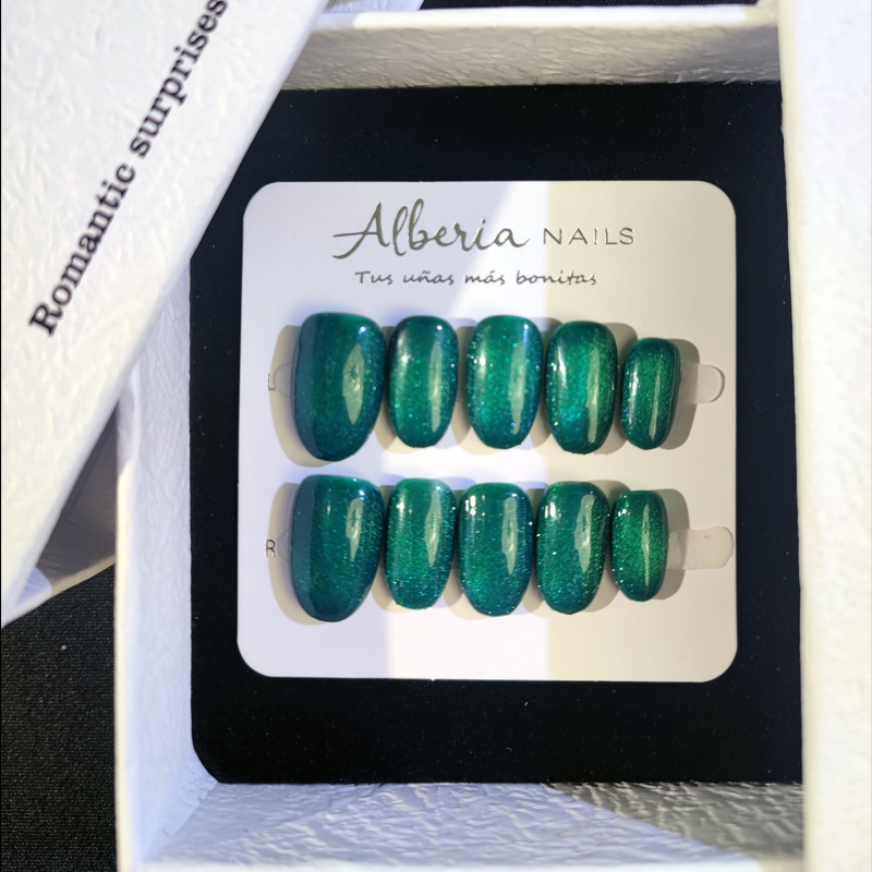 Luce un estilo sofisticado y llamativo con nuestras uñas postizas press on verde esmeralda, un tono intenso y elegante que aporta un toque de lujo a tu manicura. Su color profundo evoca riqueza, naturaleza y frescura, ideal para quienes buscan un look moderno y atrevido