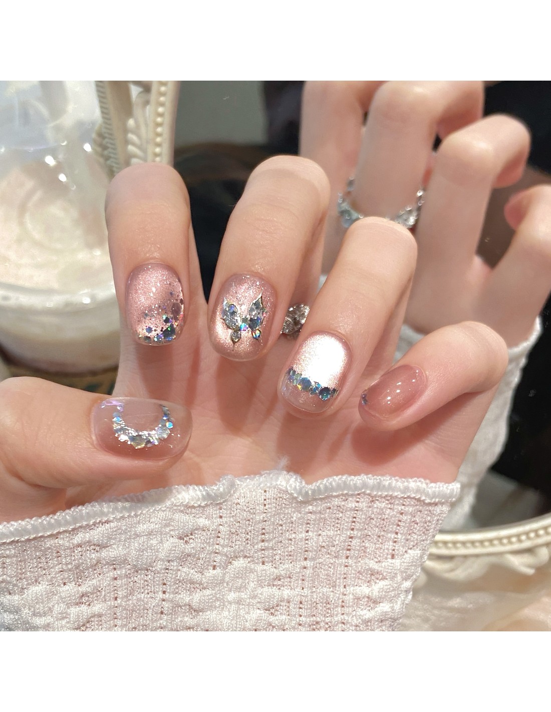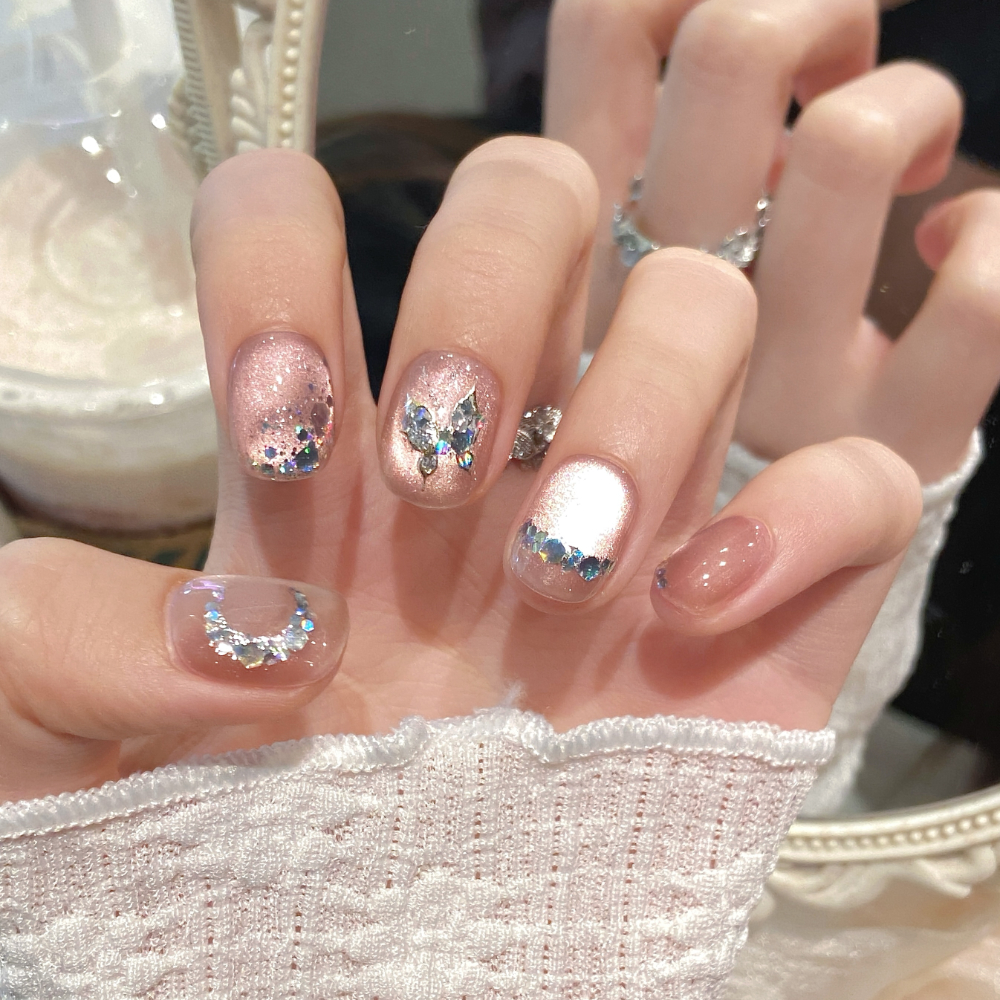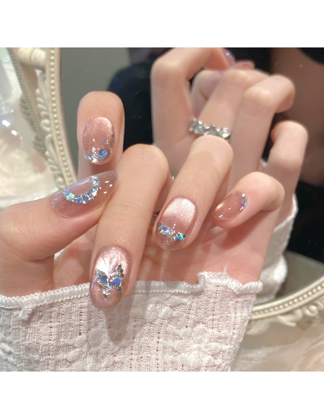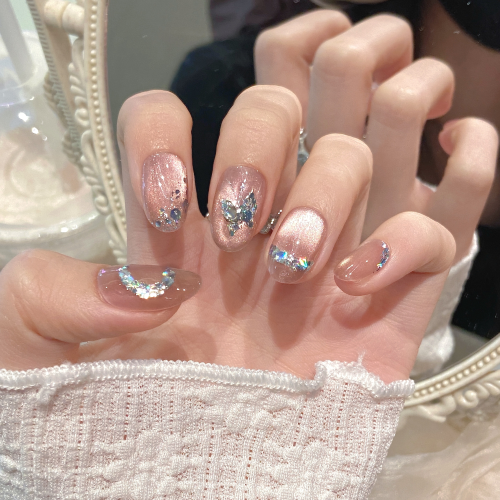 Añade un toque delicado y elegante a tu look con nuestro set de uñas postizas press on hechas a mano en un suave rosa pastel. Su efecto ojo de gato crea destellos sutiles y luminosos que cambian con la luz, mientras que los detalles de cristales y pedrería aportan un brillo glamuroso que atrae todas las miradas.