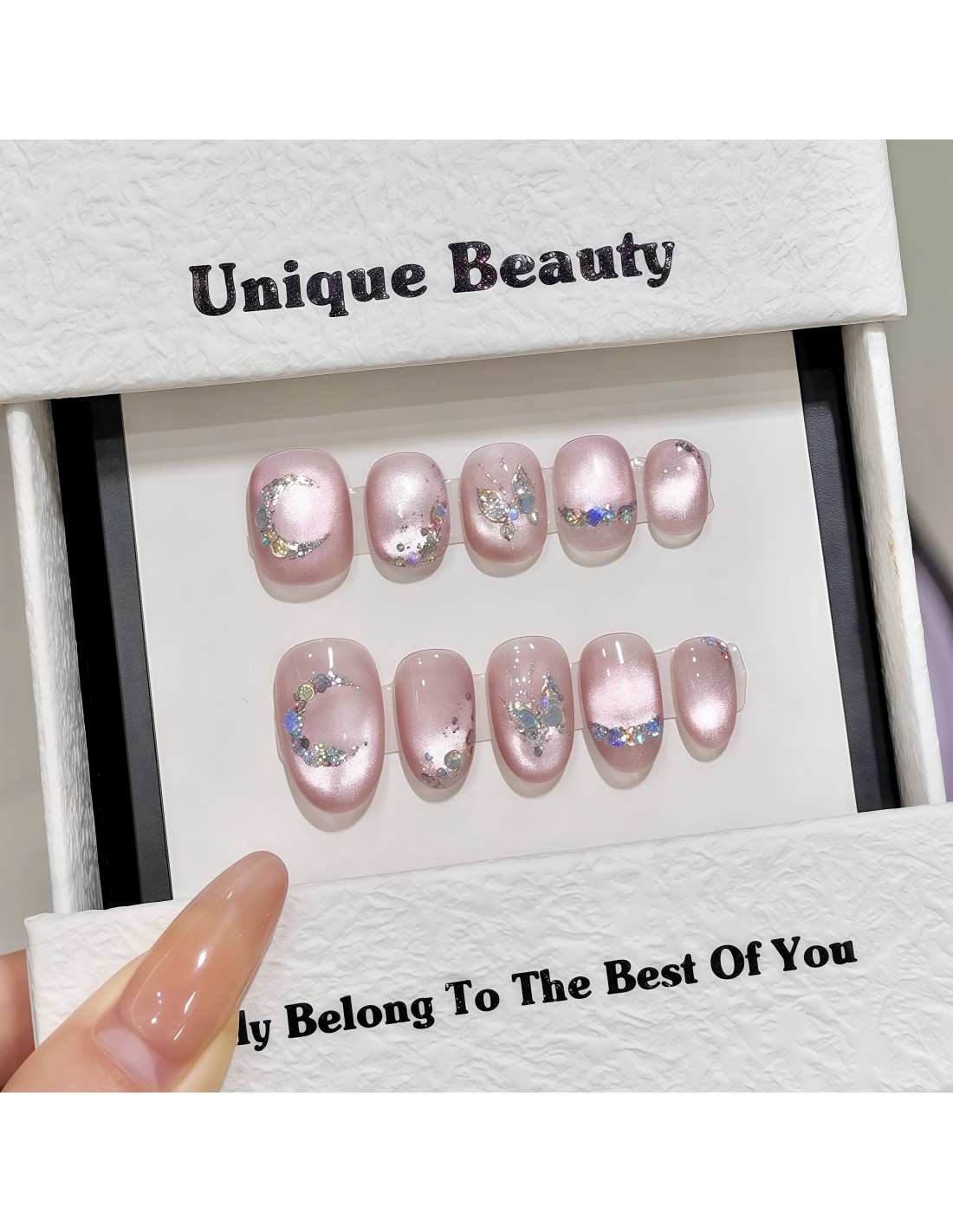 Uñas Postizas Press On Rosa Pastel – Kit Reutilizable con Cristales y Efecto Ojo de Gato