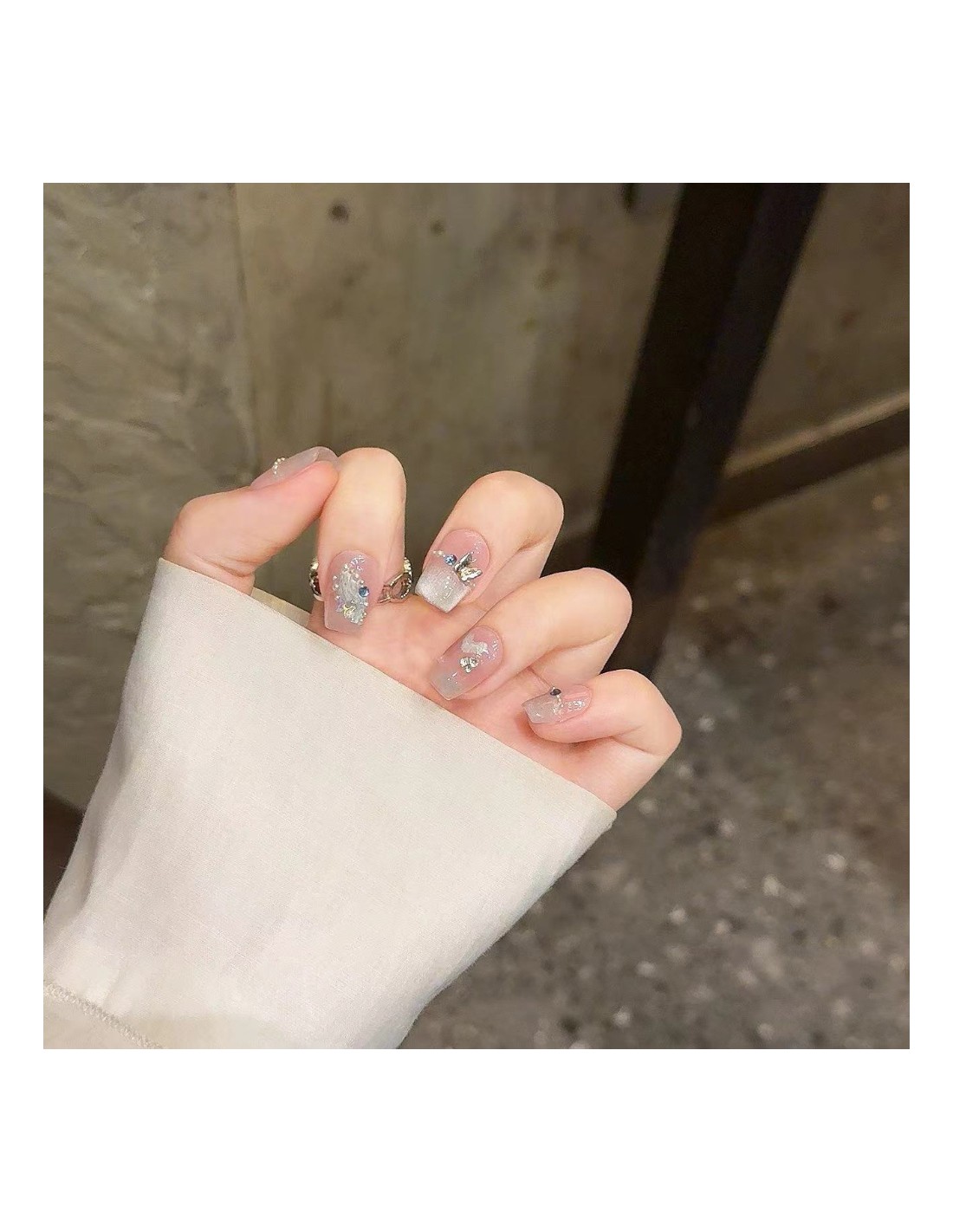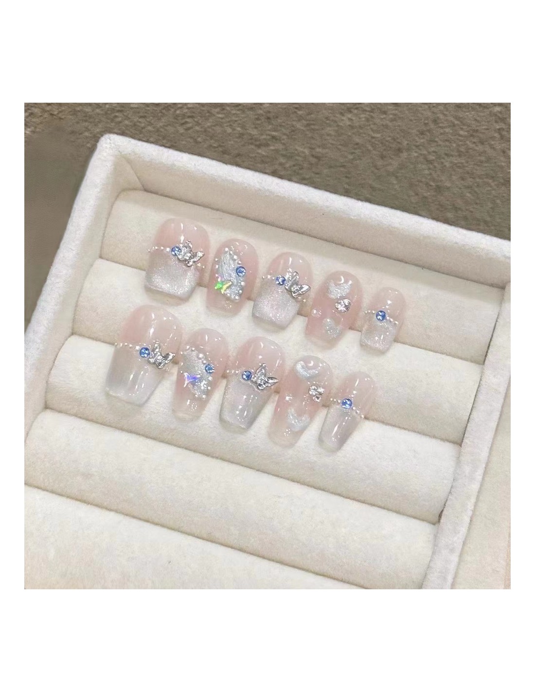 Faça as suas mãos brilhar com um estilo único graças a este conjunto exclusivo de unhas postiças, feitas à mão num cativante tom de cinzento iridescente. O seu brilho metálico marcante é realçado por cristais prateados e partículas azuis brilhantes, criando um visual sofisticado e glamoroso.