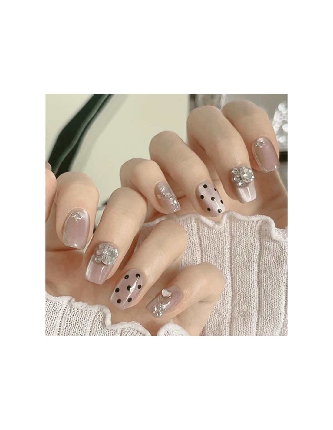 Exiba uma manicure delicada, sofisticada e estilosa com este conjunto de 30 unhas postiças semimanuais em um charmoso tom rosa claro. O efeito olho de gato adiciona profundidade e luminosidade, enquanto os detalhes de bolinhas e cristais criam um visual divertido, feminino e elegante.